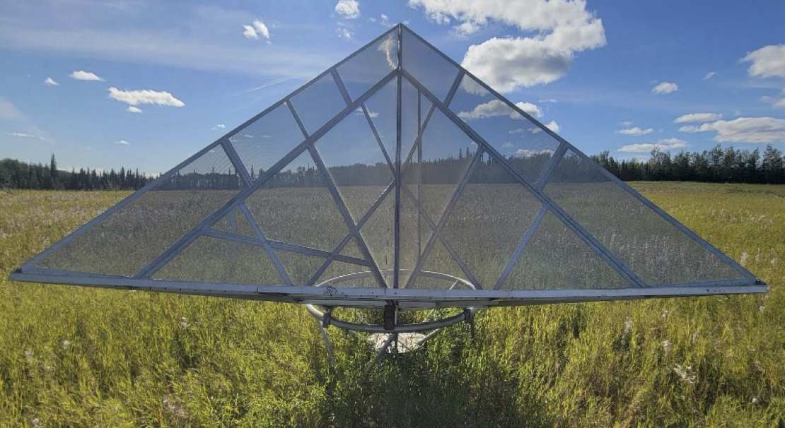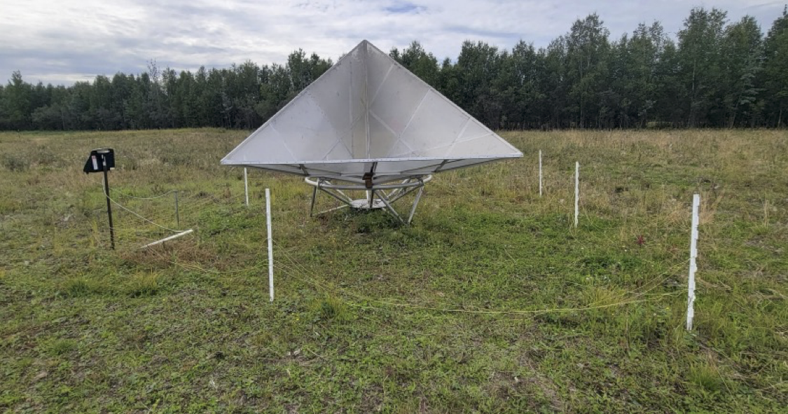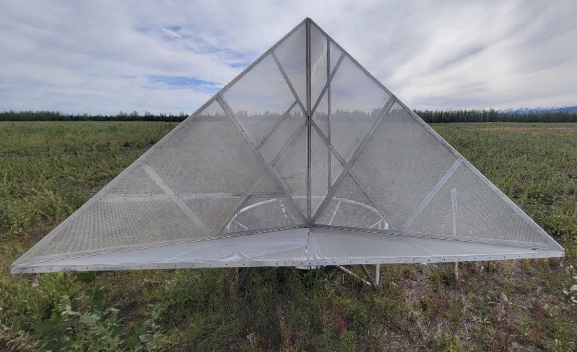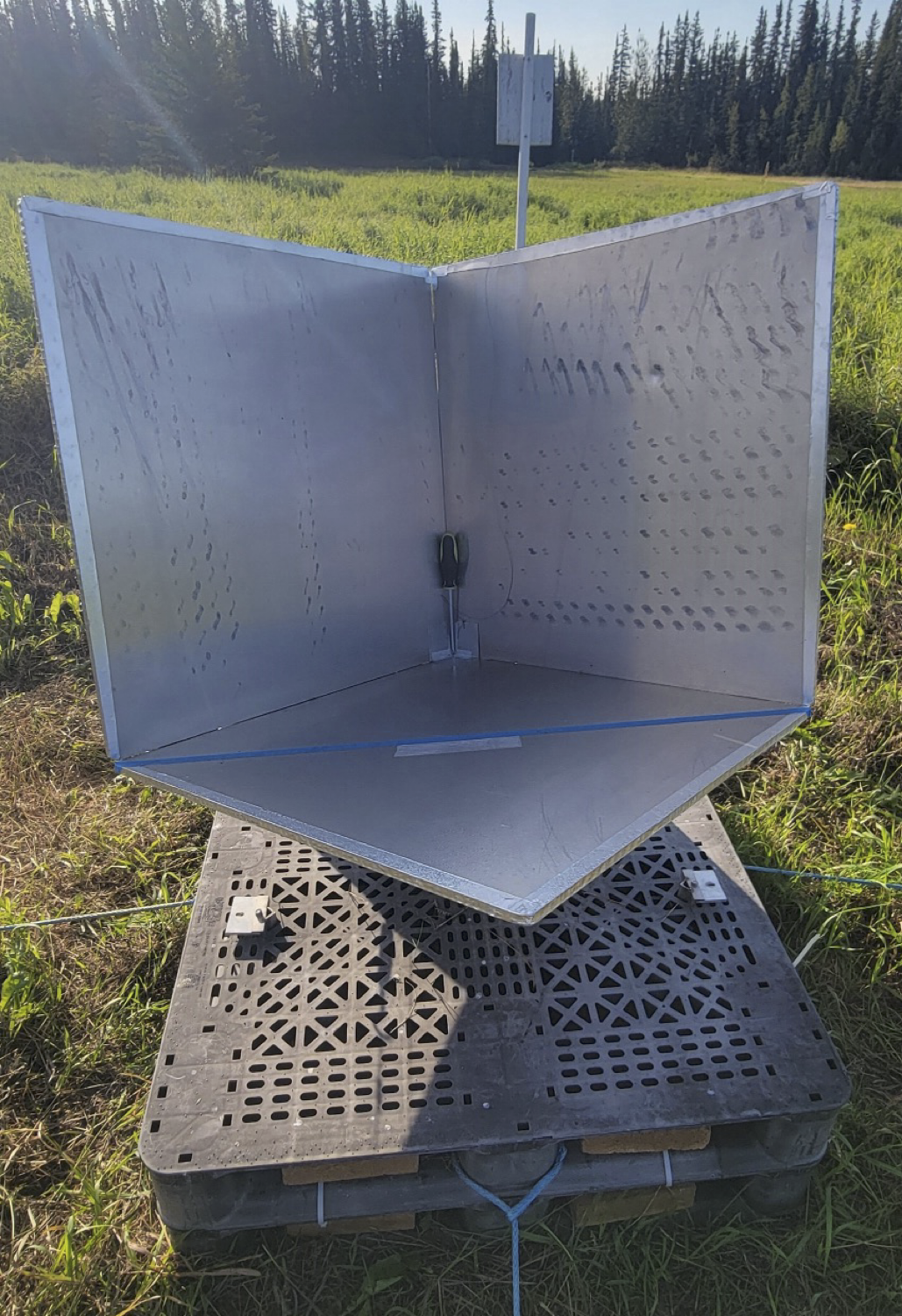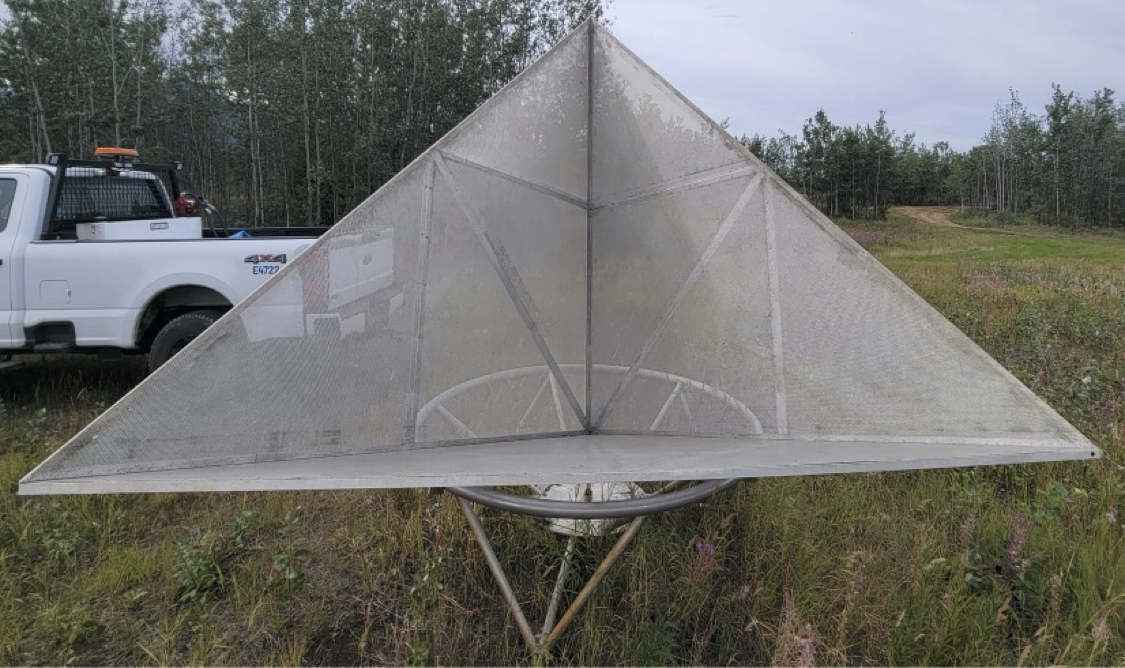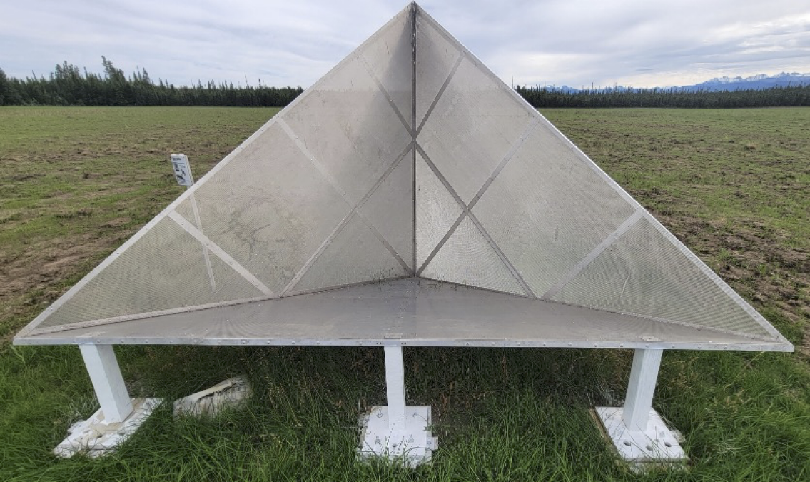 The CR site at the UAF Ag farm is ideal due to its good soil, excellent field of view, flat terrain, and year-round accessibility. It now features a 2.4-meter Generation IV CR mounted on an ASF ring base. A couple of months ago, wind damage forced us to take down this target. In May, we replaced it, removing the extensions on this 3.0-m reflector to prevent further wind damage--which now makes it a 2.4-meter target. We secured the cable on the ring base tightly and ensured that the corner reflector was firmly attached.