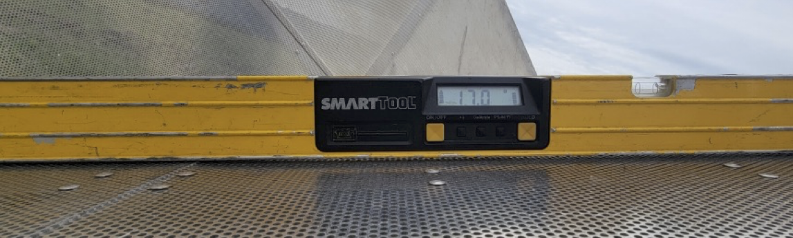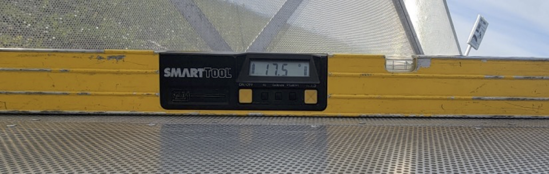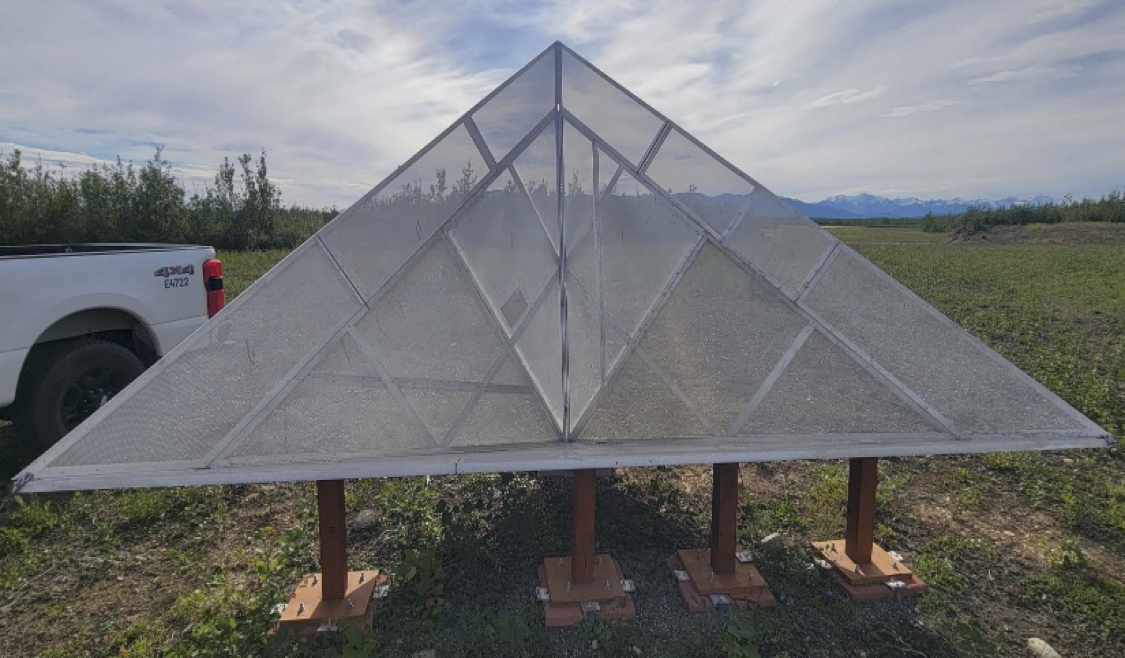 During our July inspection, this target was rotated and realigned for descending NISAR passes. To secure the pallets to the ground, we used guyot tethers and ensured that the turnbuckles were tight. We also staked down the pallets with one stake on either side. In August, we surveyed this target using GNSS for 14 hours. After the survey, we replaced the reflector on its mount, secured it, and verified the pointing angle to be 210.5° with a tilt of 17.5°